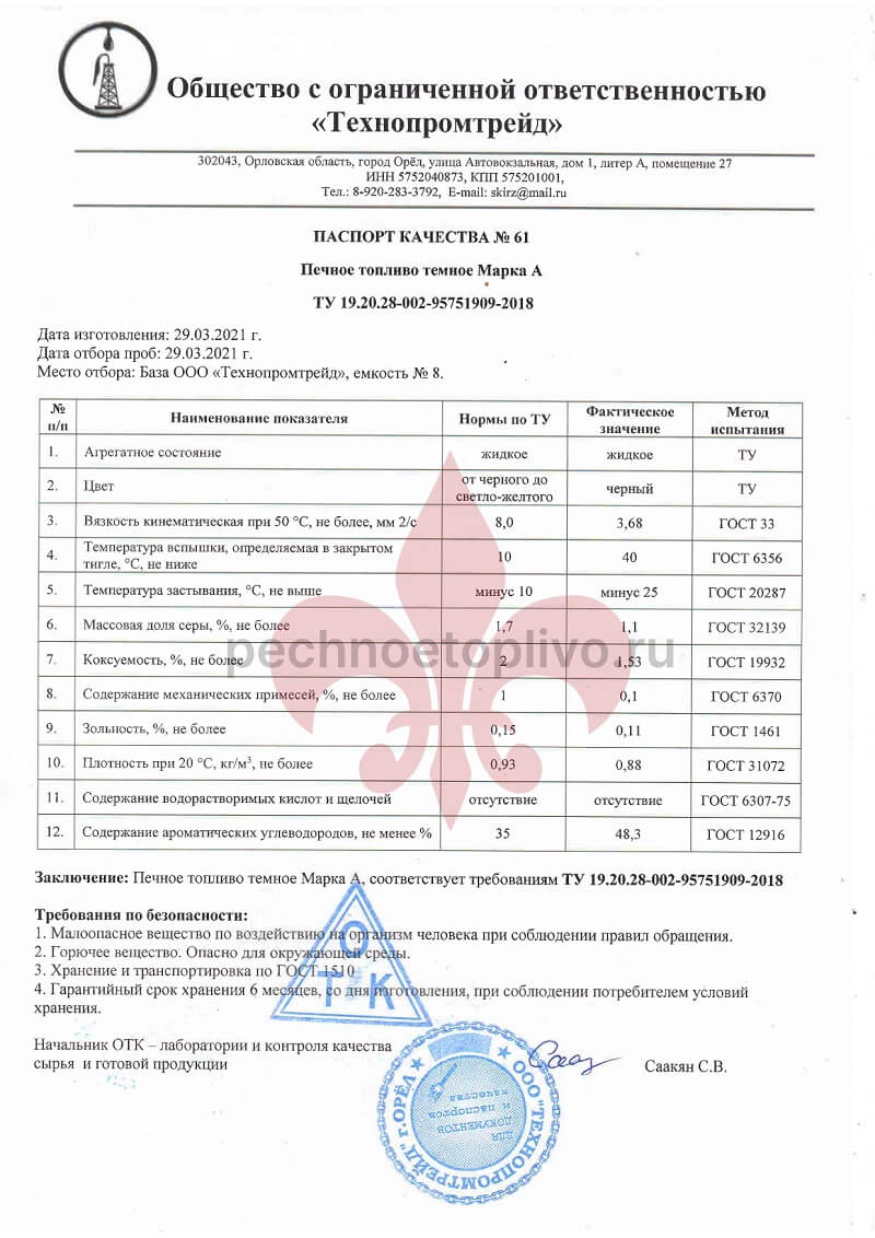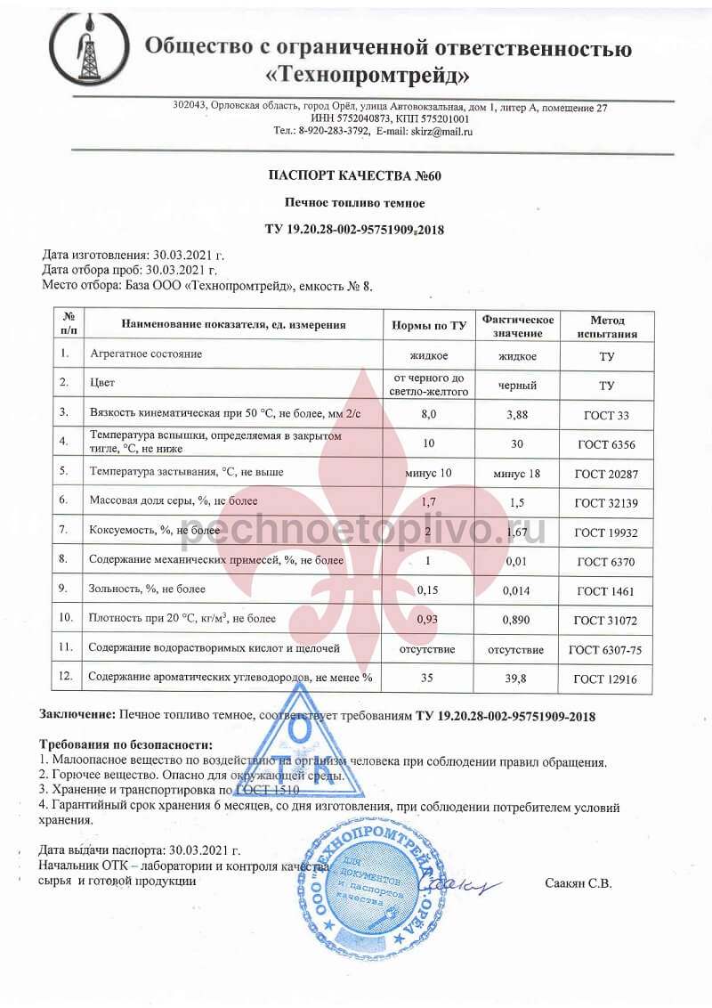 Группа компаний "Технопромтрейд" производит печное топливо темное и топливо печное бытовое. Разработка технических условий и сертификация ряда выпускаемых марок нефтепродуктов состоялась в 2018 году.